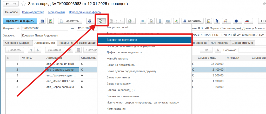 В данном случае необходимо ввести документ на основании ранее закрытого заказ-наряда «Возврат от покупателя». Находится он во вкладке «ввод на основании»