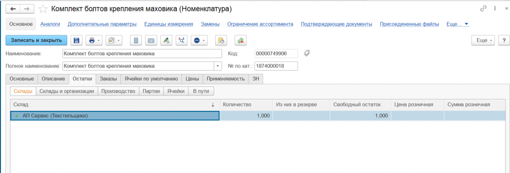 После проведения документа, бракованная деталь поступит на склад. Можно убедиться в этом войдя в карточку номенклатуры нажав на страничку остатки.