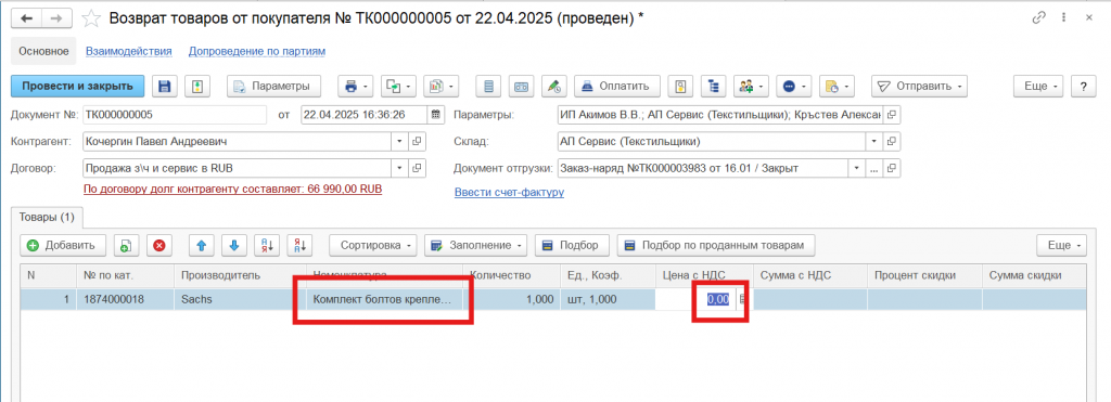 Открываем документ «Возврат от покупателя» и оставляем в табличной части детали, которые мы возвращаем от покупателя. Затем необходимо в колонке Цена с НДС указать ноль. Это необходимо для того, чтобы не возникло ошибок во взаиморасчетах с контрагентом.