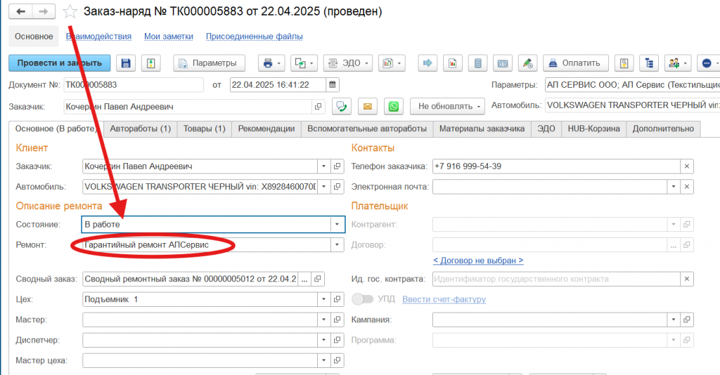 Далее Мастер-консультант открывает «заказ-наряд» со значением «Гарантийный ремонт АПСервис» в строке «ремонт»