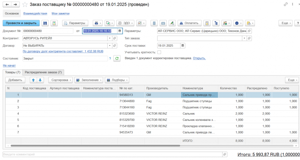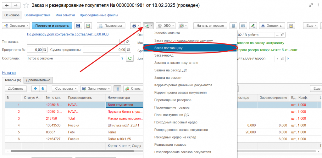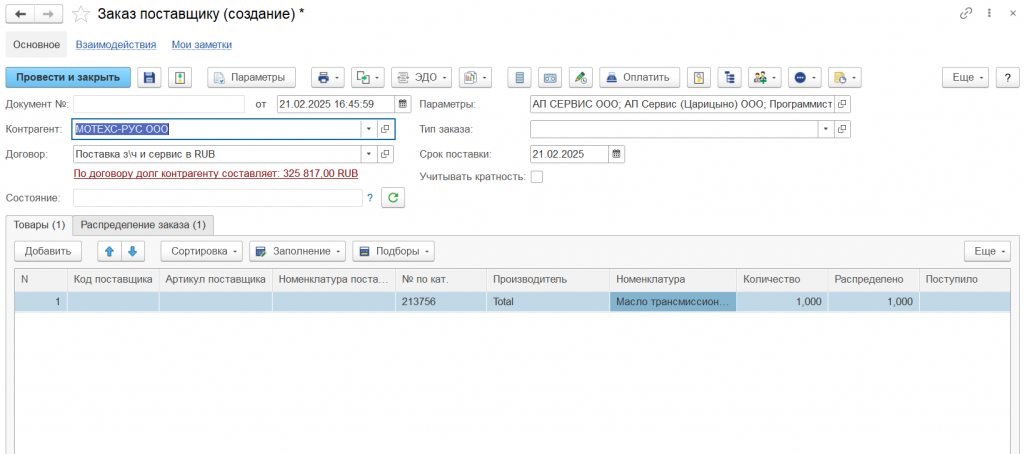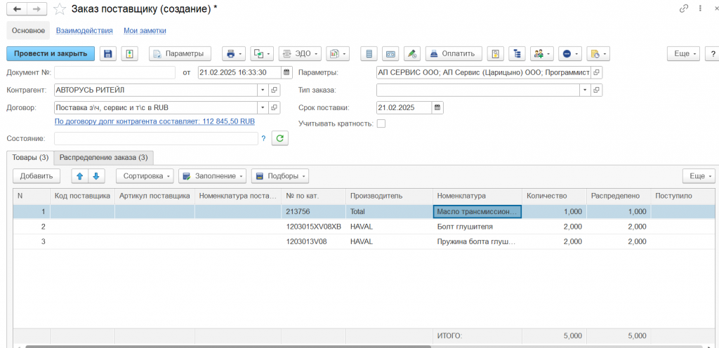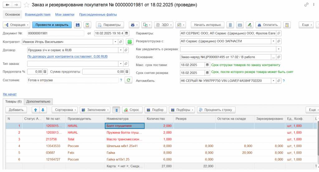 Тут также автоматически появится деталь, которую необходимо заказать. Затем проводим и закрываем. Далее при поступлении, заказанные у поставщиков детали, попадут в резерв по заказ-наряду, затем сотрудник склада сможет благополучно переместить их в заказ-наряд.