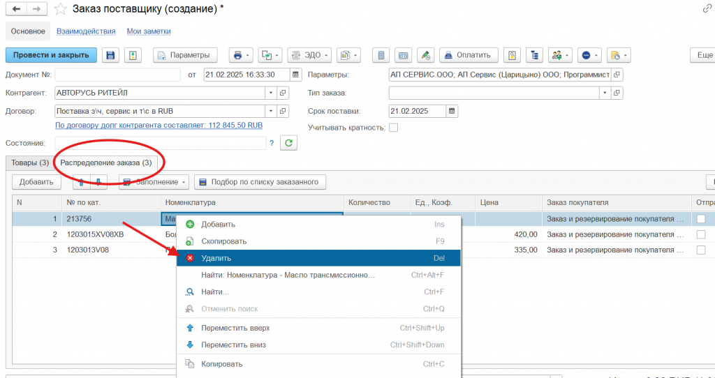 Табличная часть документа автоматически заполнится деталями, которые необходимо заказать, но представим, что позицию под номером «1», необходимо заказать у другого поставщика. Поэтому удалим данную позицию, из странички «распределение заказа» (ИЗ СТРАНИЦЫ ТОВАРЫ, УДАЛИТЬ ДЕТАЛЬ НЕЛЬЗЯ!!!) И проводим документ.