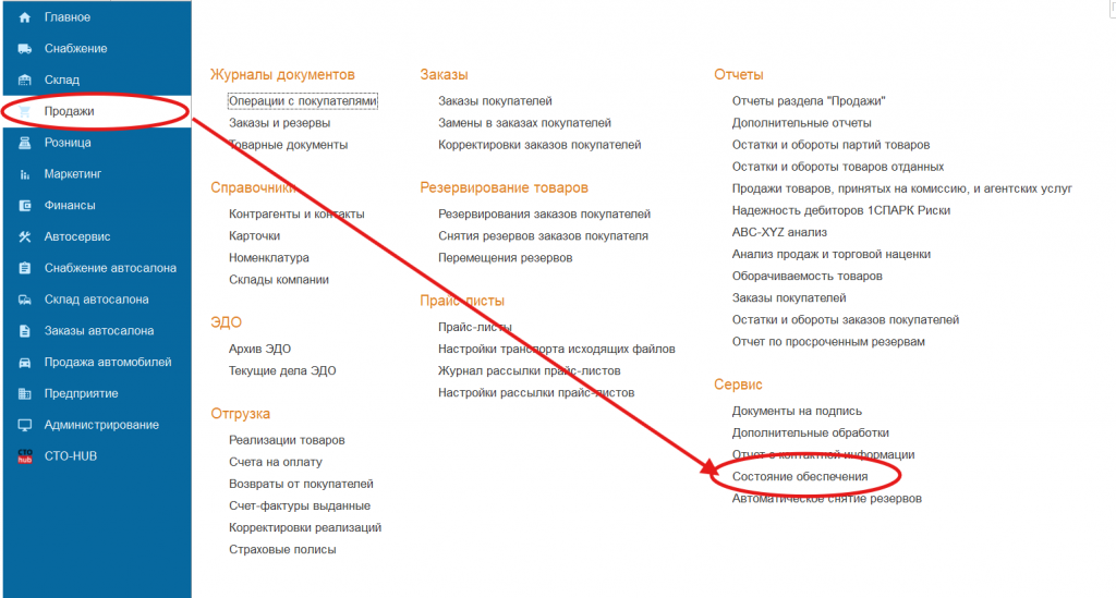 Отслеживать состояние заказов покупателей и заказов поставщикам можно отслеживать в обработке «состояние обеспечения». Находится она в подсистеме «Продаже» в блоке «Сервис»