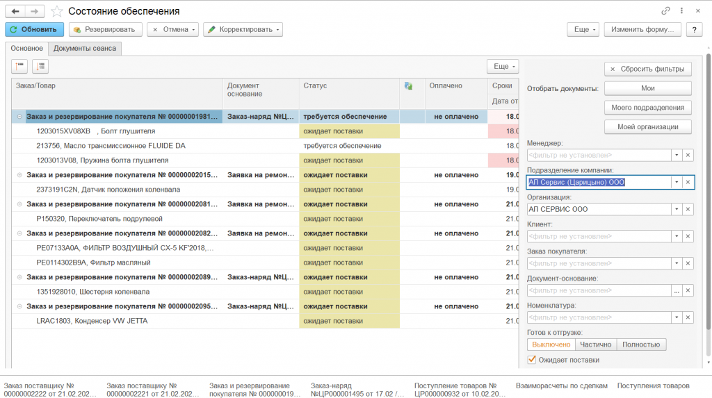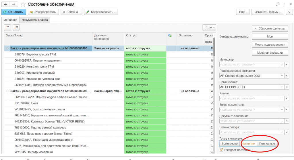 В правой колонке в строке «Подразделение компании» выбираем необходимое нам значение и перед нами появляется список заказов. В колонке статус вы можете обратить внимание на значения «ожидает поставки» и «требуется обеспечение». «ожидает поставки» означает, что деталь уже заказана у поставщика, «требуется обеспечение» означает, что необходимо оформить «заказ поставщику». Также нажав на кнопку «частично» или «полностью» в нижнем правом углу экрана, вы можете получить информацию об уже готовых к перемещению полностью или частично деталях