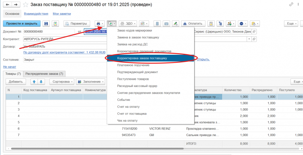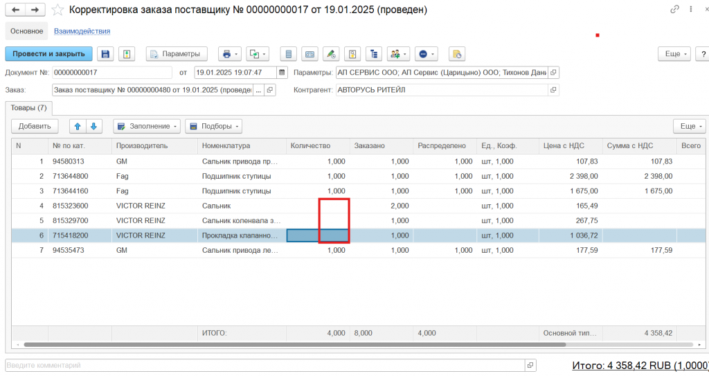 Представим, что клиент отказался полностью (либо частично) от ремонта. В колонке «Поступило» вы увидите, что есть детали, которые уже поступили. Произвести корректировку на них мы уже не сможем (на них уже делает «возврат поставщику» кладовщик), но детали под номерами : 4,5,6, все еще не поступили и отменить на них заказ мы можем с помощью документа «корректировка заказа поставщику».
