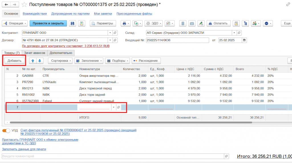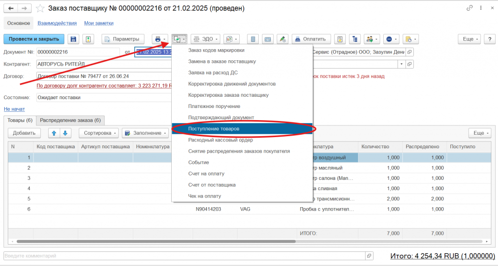 Затем Вам откроется документ «поступление товаров» табличная часть, которого будет автоматически заполнена заказанными деталями