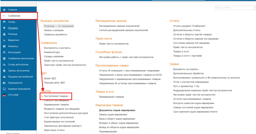 В зависимости от учетной политики компании, «Поступление товаров» вводится либо «без основания», либо «на основании». Рассмотрим первый вариант (действующий в АП-Сервисе на данный момент). Для этого необходимо перейти в подсистему «Снабжение» и в блоке «Закупка» выбрать пункт «Поступление товаров»