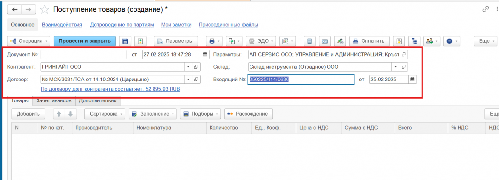 Нажав на нее перед Вами откроется форма документа, в которой Вам необходимо заполнить все необходимые реквизиты, выбрать правильный договор и указать входящий номер документа