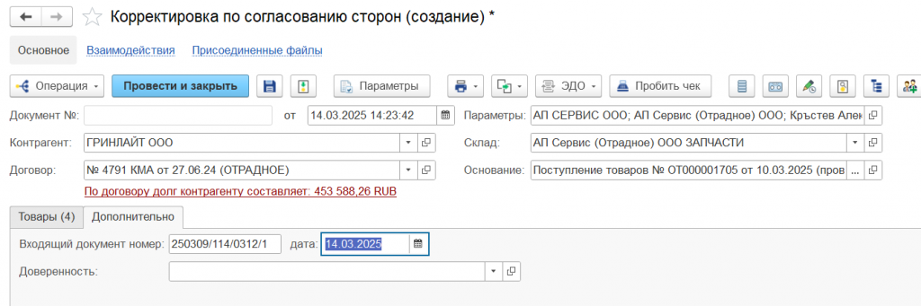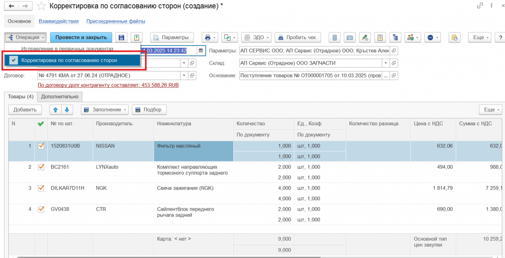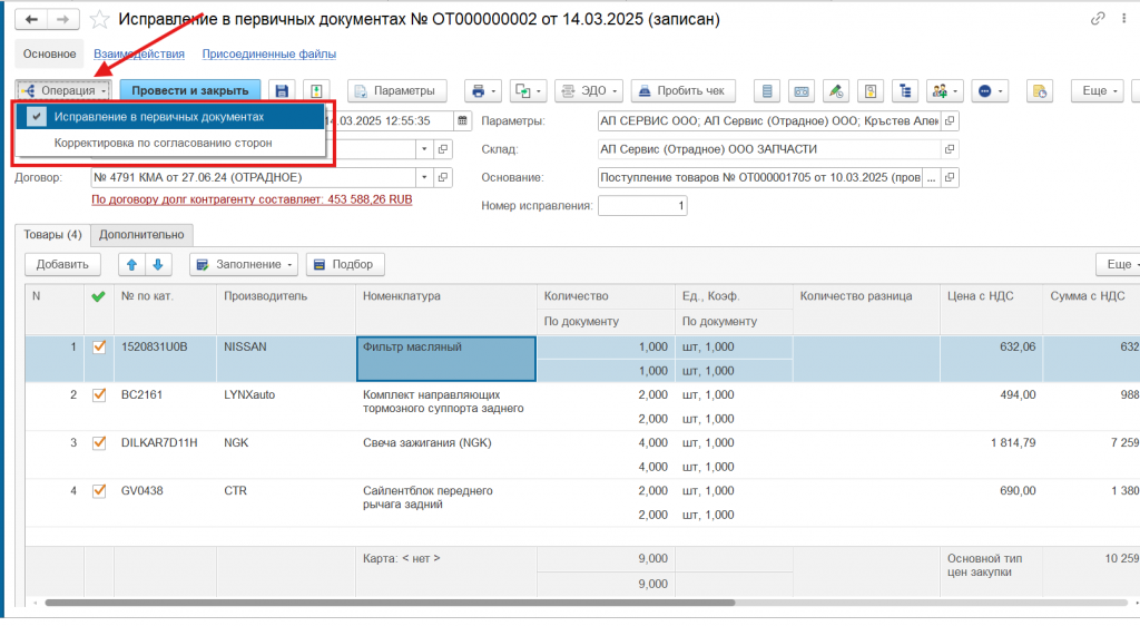Разница между этими двумя хоз.операциями в том, что «исправление в первичных документах», необходима для исправления некорректно введенных данных, например: номер документа. Хоз.операция «корректировка по согласованию сторон» необходима для оформления возврата поставщику, возврата деталей от контрагента, возврата денежных средств и другое… Данный документ является универсальным, для специалистов склада, мастеров-консультантов и кассиров-бухгалтеров. ВАЖНО ВЫБИРАТЬ ПРАВИЛЬНУЮ ОПЕРАЦИЮ!!! БУДЬТЕ ВНИМАТЕЛЬНЫ.