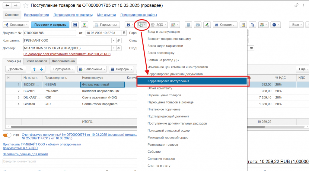 Оформляется он в подменю «ввод на основании» в самом документе поступления.