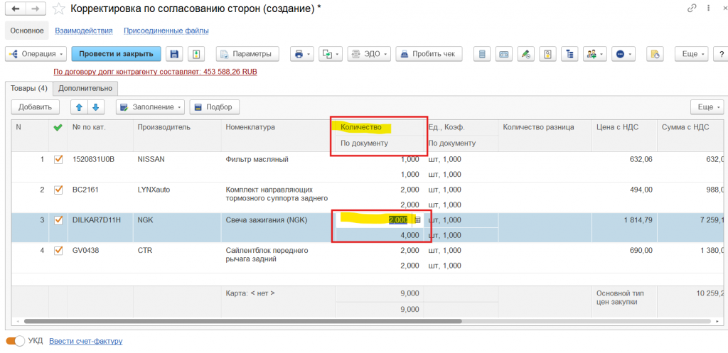 В случае если деталь необходимо вернуть частично, необходимо вычесть в подстроке «количество», то кол-во деталей, которое мы возвращаем. ВАЖНО обратить внимание на то, что в строке табличной части есть две подстроки: верхняя-количество, нижняя-по документу