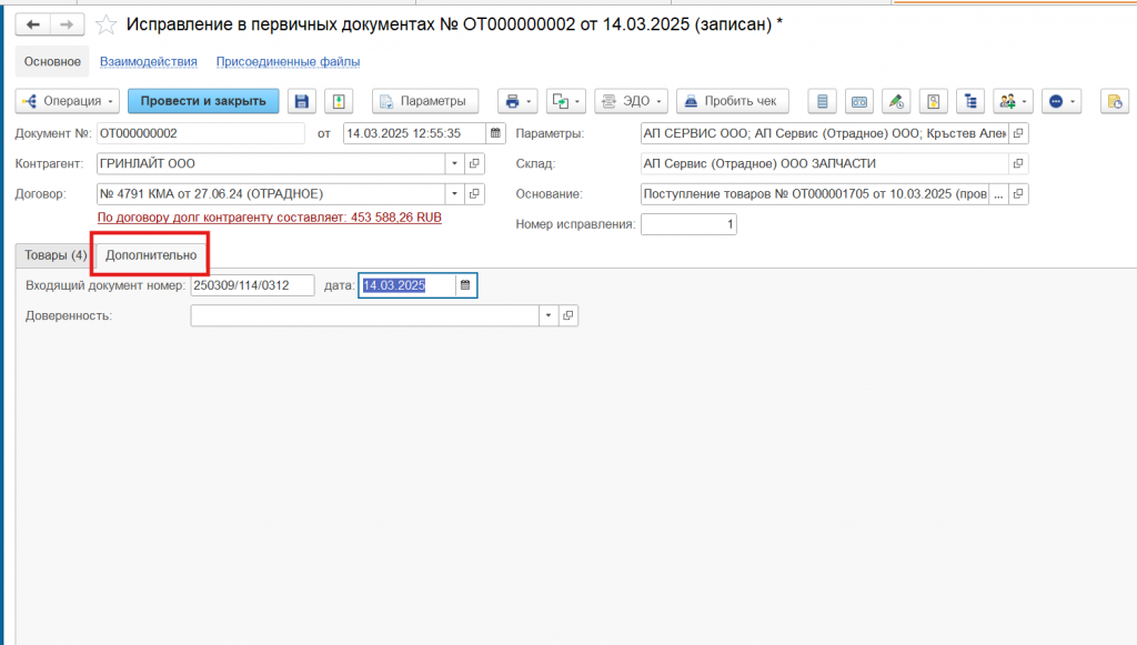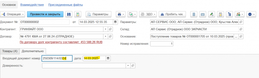 Далее исправляем номер документа в строке «Входящий документ номер:» и ставим дату редактирования, затем нажимаем «Провести и закрыть»