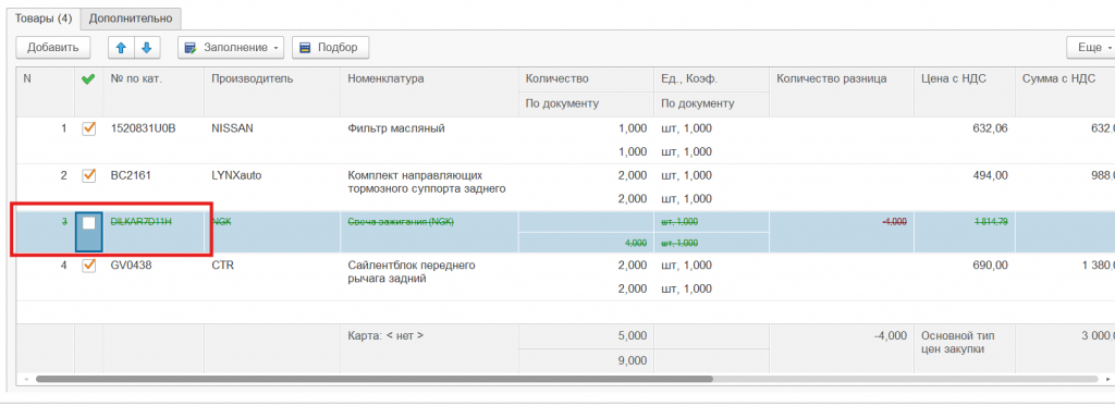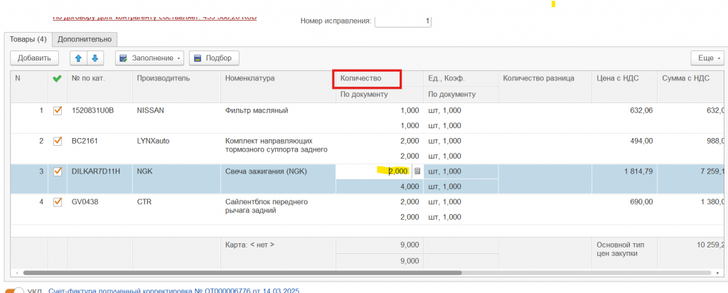Также есть возможность исправить ошибочно внесенные в документ поступления детали либо их количество. Для нужно перейти на страницу «товары» и исправить строку «количество»