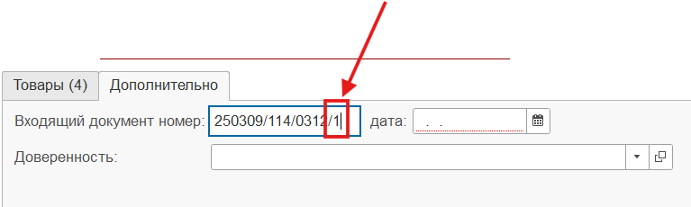 Далее на странице «дополнительно» необходимо указать номер документа поступления и добавить через дробь цифру 1 (при повторном оформлении цифру 2 и т.д.)