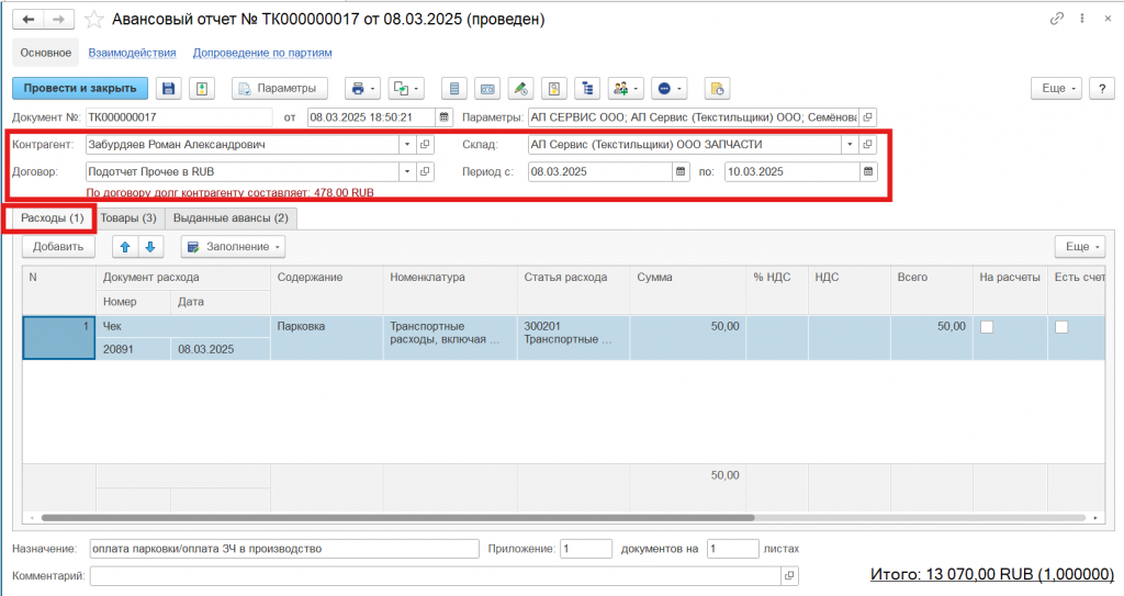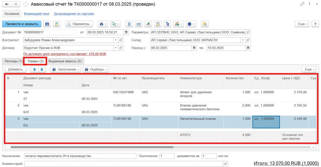 ВНИМАНИЕ! Для избежания ошибок при приеме товара и заполнении документа, табличную часть «Товары» заполняет Специалист склада. Через Авансовый отчет приходуем только товары, приобретенные за наличный расчет или по карте предприятия по которым есть кассовые чеки.