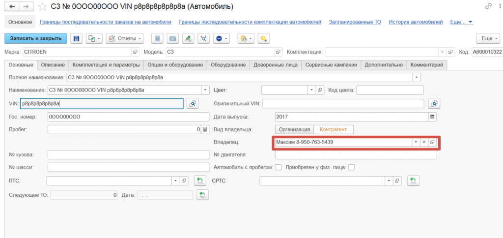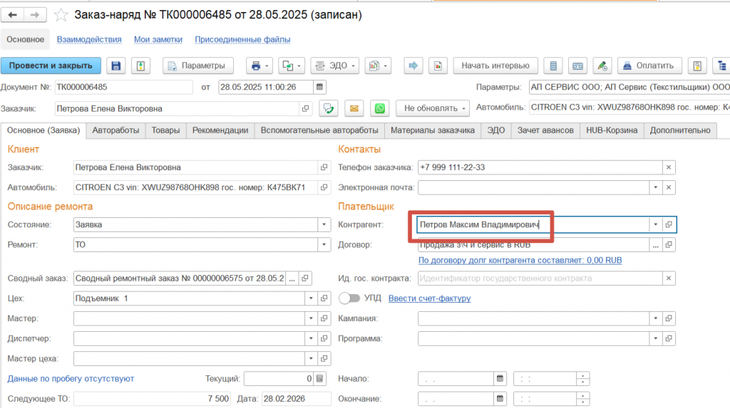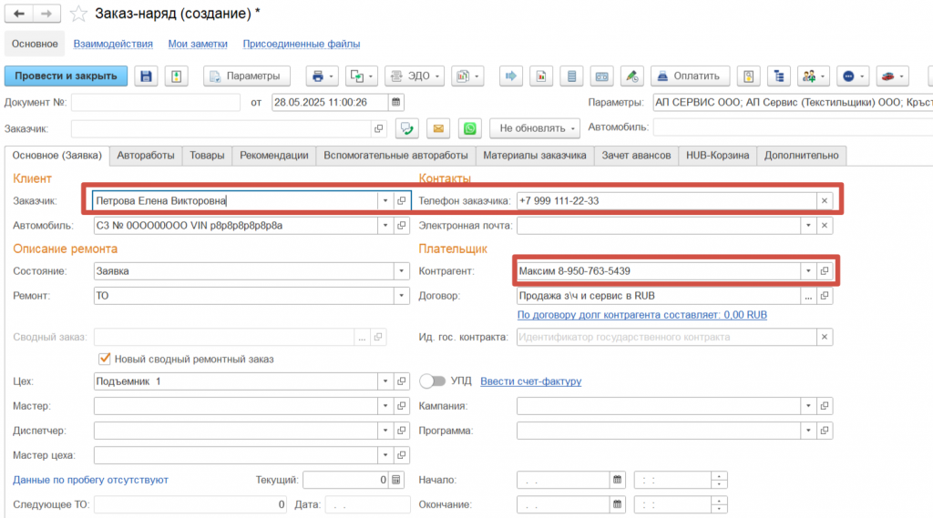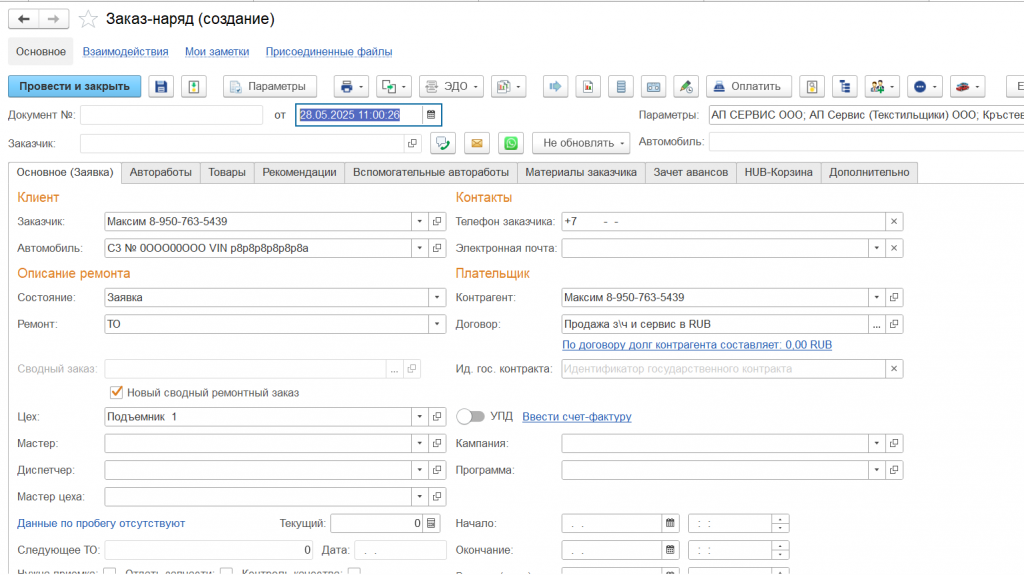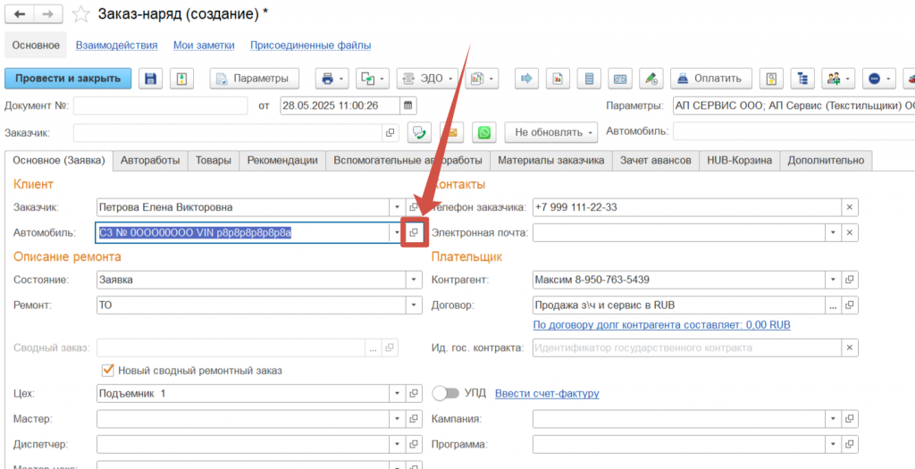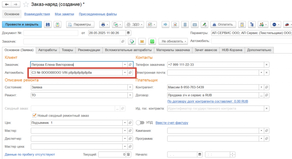 Далее на странице «автомобили» мы можем внести данные автомобиля, но лишь в том случае если заказчик является собственником!!!!! В нашем примере это не так, поэтому пропустим этот этап. Нажимаем «Записать и закрыть». Теперь в заказ-наряде будет отображена заполненная нами карточка контрагента. Также обратим внимание, что номер телефона изменился на номер нынешнего заказчика, а поле «контрагент» в блоке «Плательщик» осталось прежним. Если Вы знаете что заказчик будет плательщиком то можете сразу заменить в нем значение. В нашем примере не будем менять