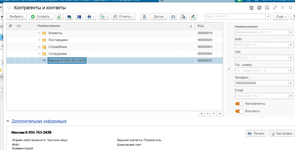 Находим в открывшемся списке контрагента по номеру телефона и выбираем