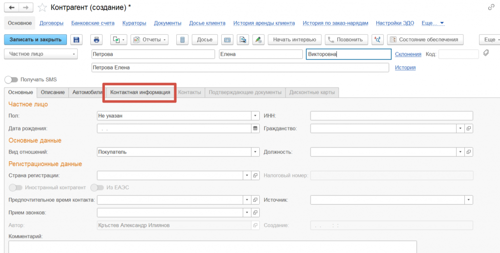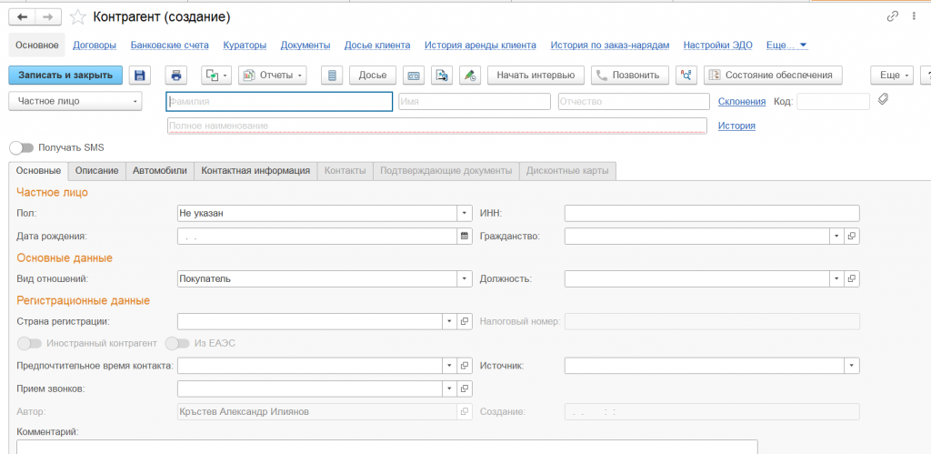 Первое лицо с которым мы контактируем это «Заказчик». Он привозит автомобиль, согласовывает фронт работ с МК, соответственно его данные и необходимо внести в его карточку контрагента.