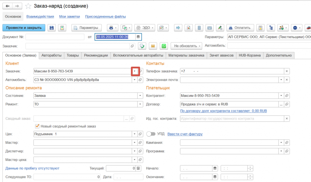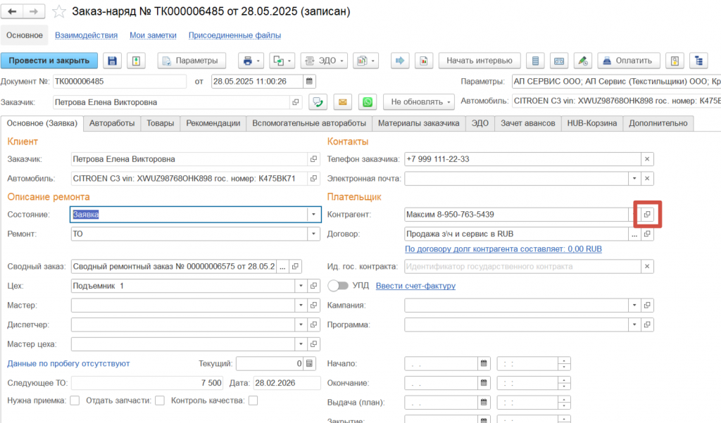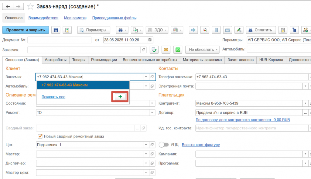 Создание/Заполнение/Изменение карточки контрагента в Заказ-наряде