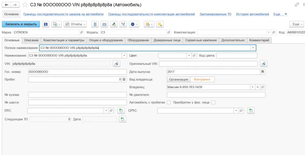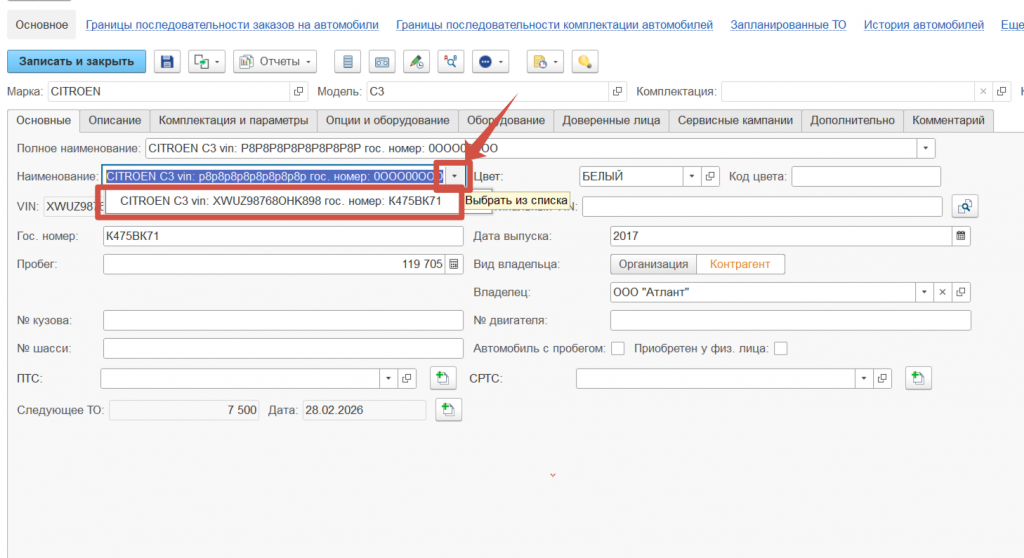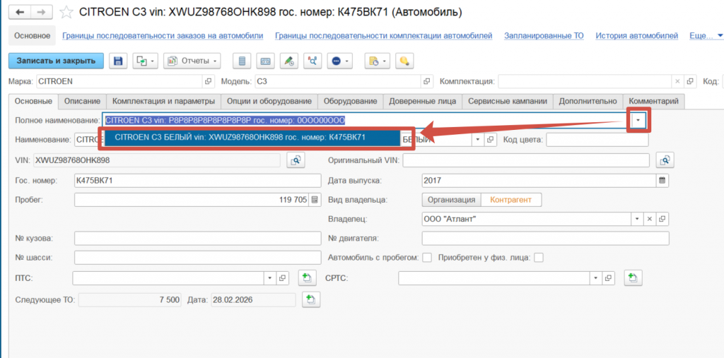 Обратите внимание что Наименование и Полное Наименование все еще отображается некорректно. Дело в том что оно формируется и сохраняется самостоятельно один раз при создании карточки автомобиля. Исправить это можно просто нажав на стрелку и перевыбрав автомобиль
