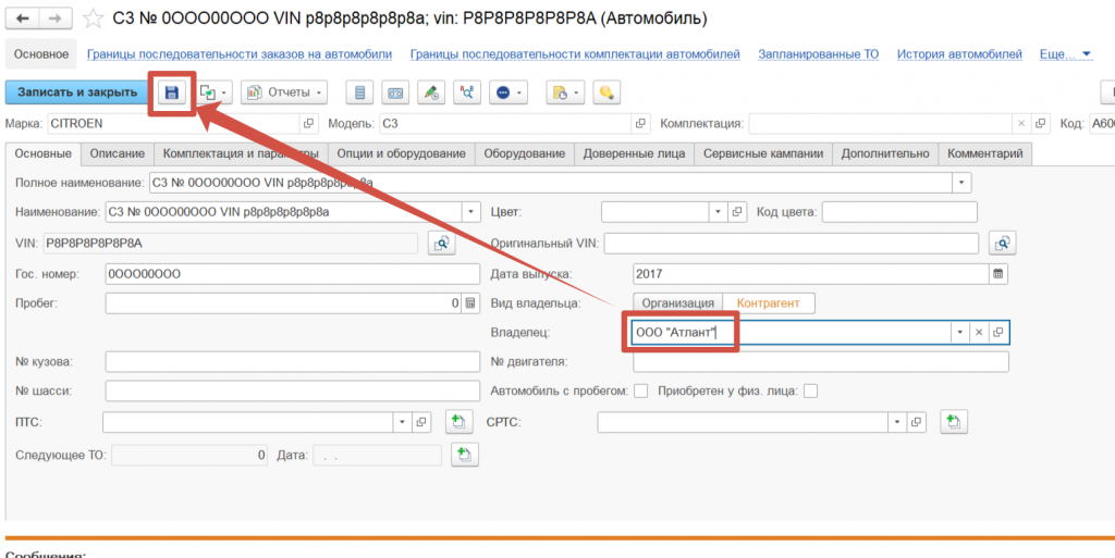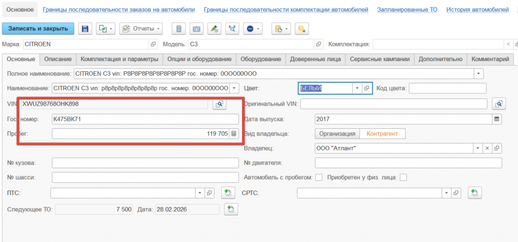 Обратите внимание на то что автомобиль автоматически был добавлен на страницу «Автомобили» в карточке контрагента ООО «Атлант». Это произошло потому что ранее в карточке автомобиля мы изменили владельца и с помощью кнопки «записать» мы сохранили изменения. Теперь вносим корректные данные. Изменяем VIN номер автомобиля и гос.номер