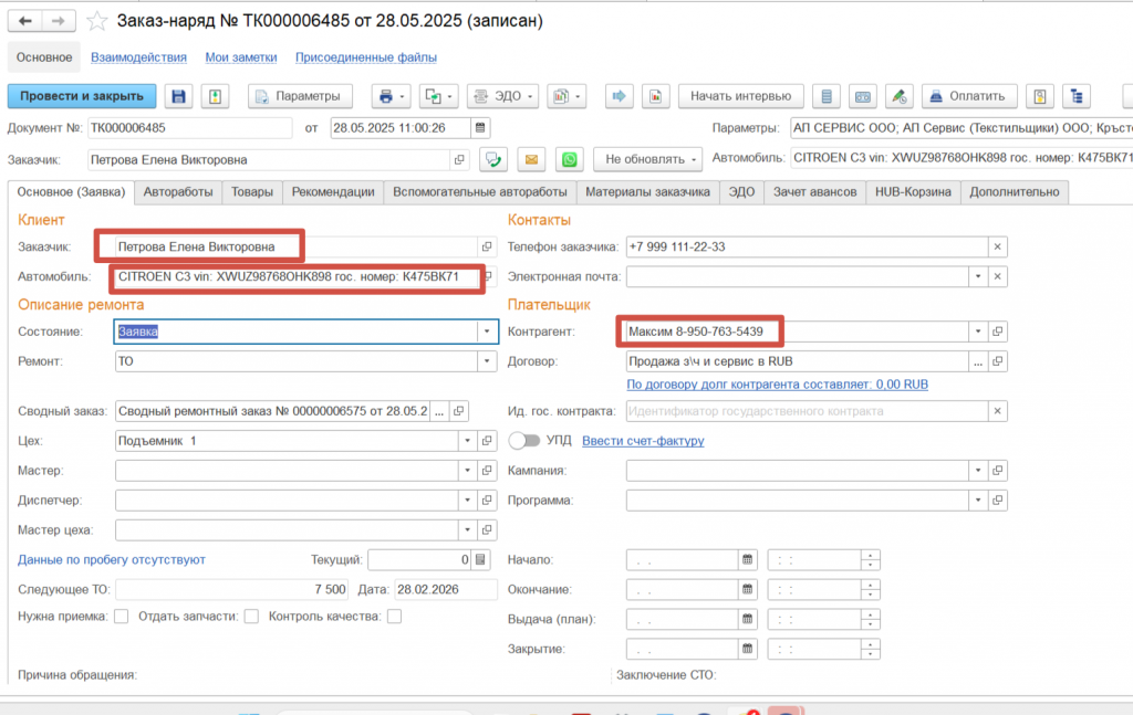 Обращаю Ваше внимание на то что Вы можете заполнять все данные в другой последовательности, но главное чтобы номера телефонов соответствовали контрагентам. Обязательно уточните номер телефона у того, кто привез автомобиль. Если его привез другой человек и его номер не совпадает с номером контрагента в заявке создайте новую карточку и нового заказчика. Не нужно вносить в одну карточку данные нескольких лиц.