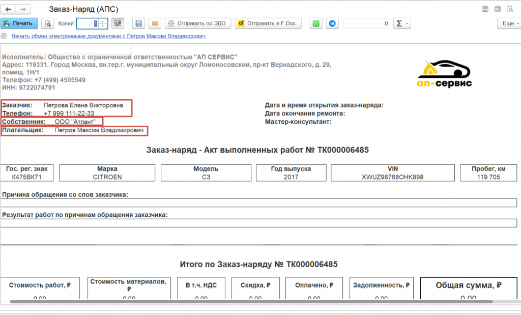 Теперь у нас оформлен заказ-наряд в котором фигурируют разные заказчик, плательщик и собственник автомобиля