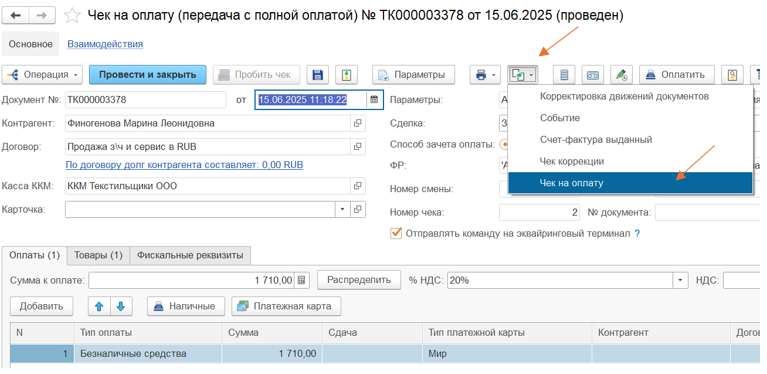 При допущении ошибки во время приема оплаты (допустим неверно выбрать тип оплаты карта/наличные или клиент хочет внести часть ДС, а чек пробит на полную сумму), следует сделать отмену чека «день в день», это возможно при условии не закрытой кассовой смены. На основании документа «Чек на оплату» вводится еще один документ «Чек на оплату», который открывается с хозяйственной операцией «Возврат по чеку на оплату» и полностью копирует чек оплаты.