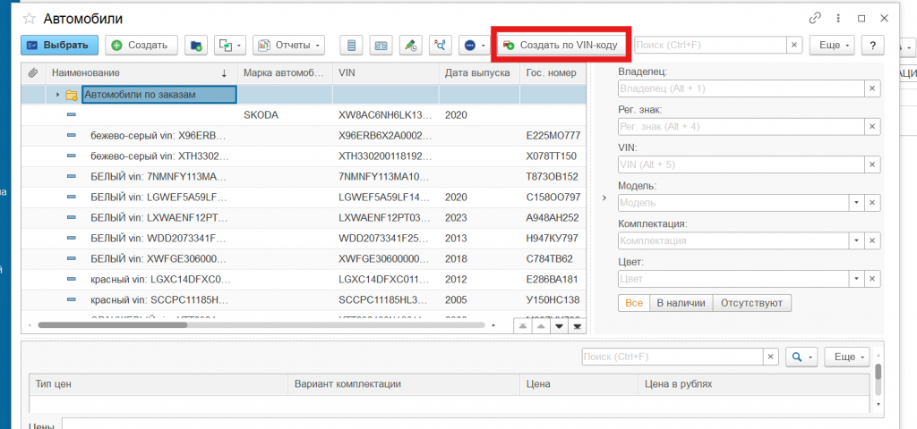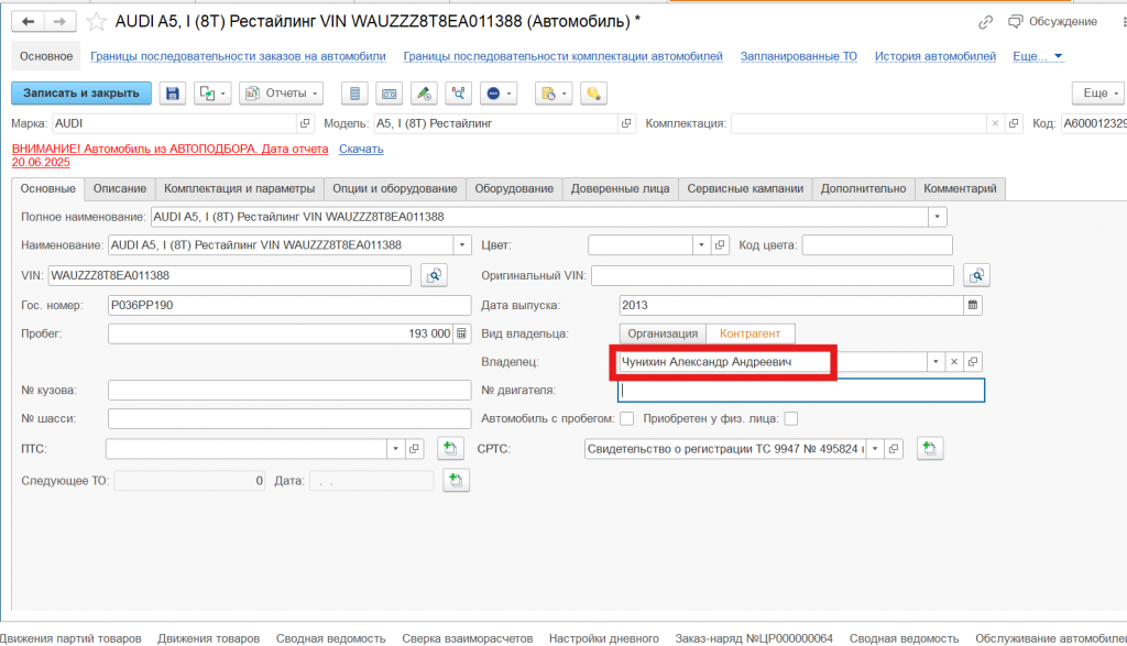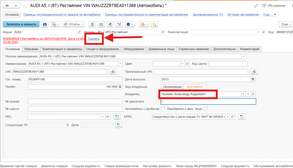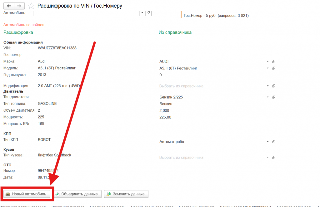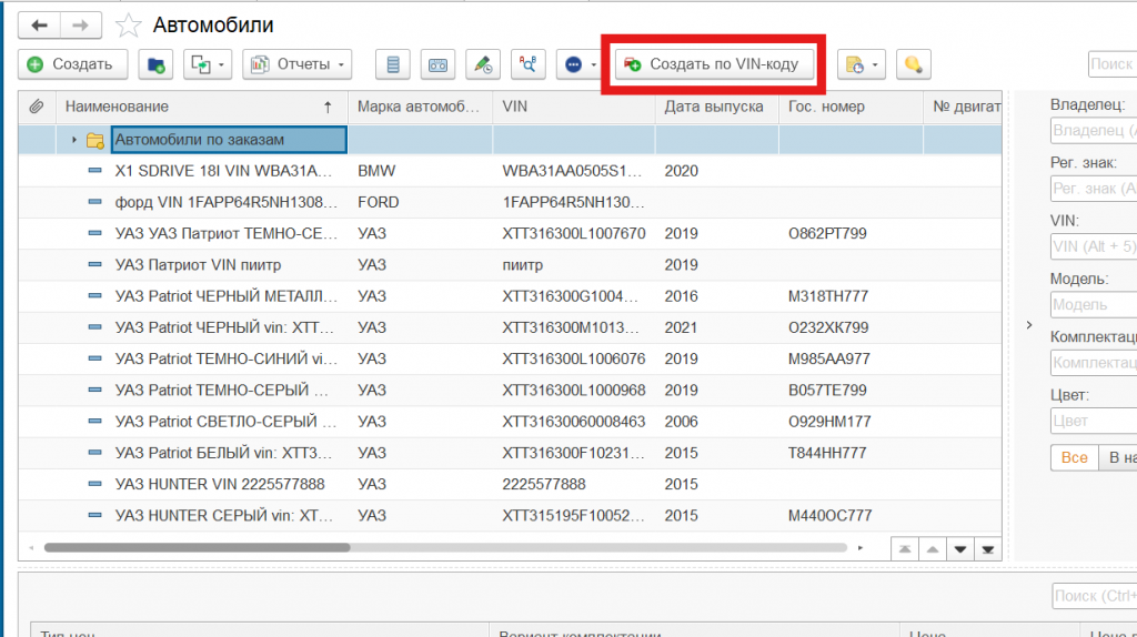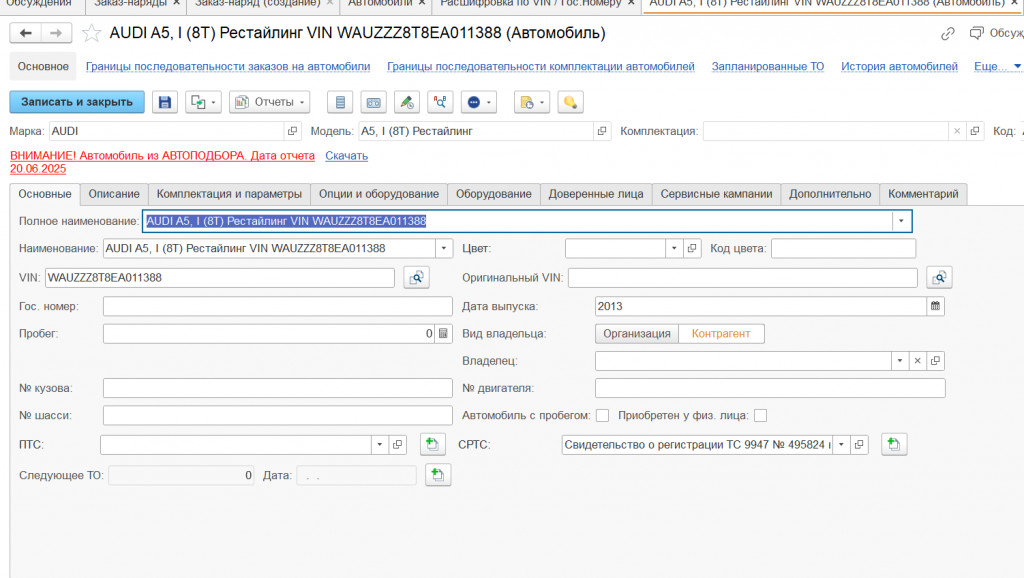 ВНИМАНИЕ!!! Не создавайте автомобиль если он уже есть в базе данных, это повлечет создание дублей и ошибки