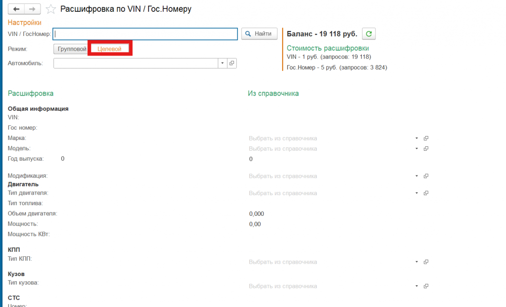 В открывшейся форме выбираете режим поиска «целевой» и вводите гос.номер или вин-код в поле «VIN/Гос.номер» и нажимаете «Найти»