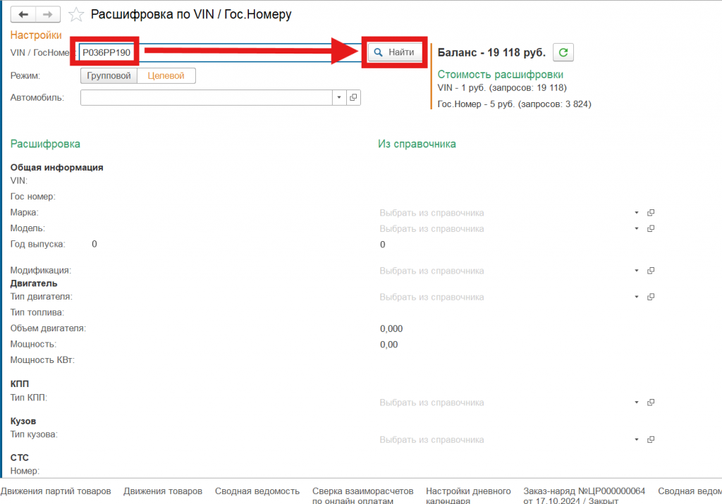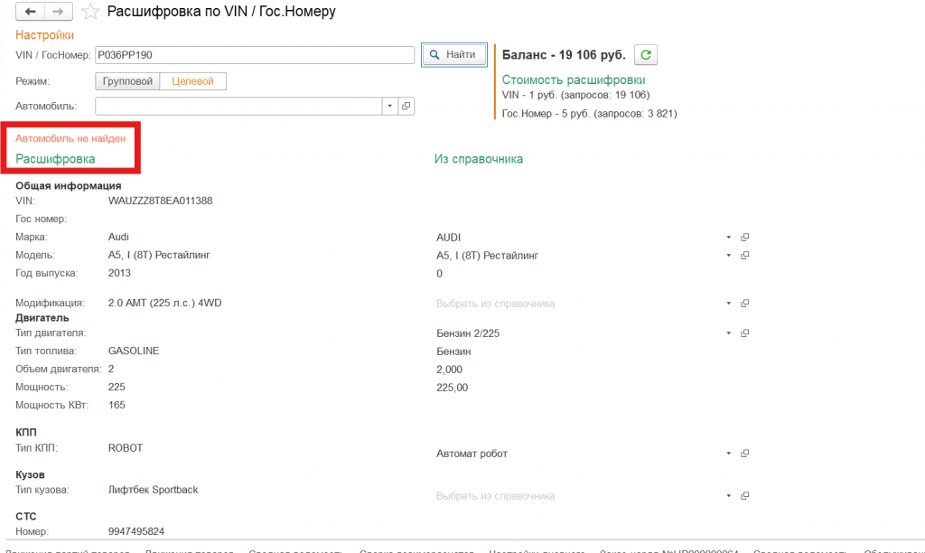 В столбце «Расшифровка» появится информация из сервиса поиска. А немного выше Вы увидите сообщение «автомобиль не найден». Данное сообщение говорит о том, что такой карточки автомобиля у нас в базе нет!