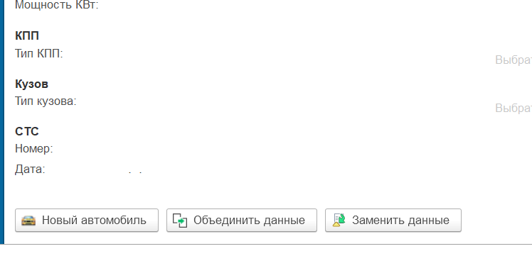 Кнопку «Новый автомобиль» Вы уже знаете, «Объединить данные» нужно нажать если необходимо добавить в карточку справочника недостающие реквизиты из базы данных, «Заменить данные» нажимаем если нужно заменить данные в справочнике на данные из столбца «Расшифровка»