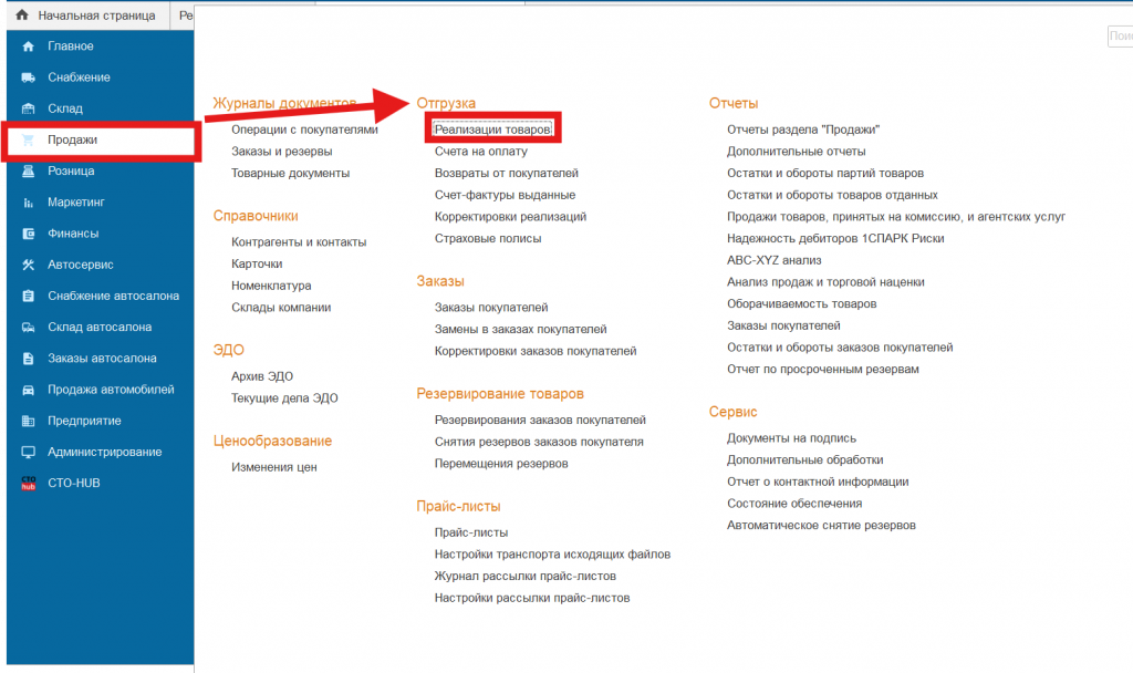 Находим подсистему Продажи — Отгрузка — Реализации товаров