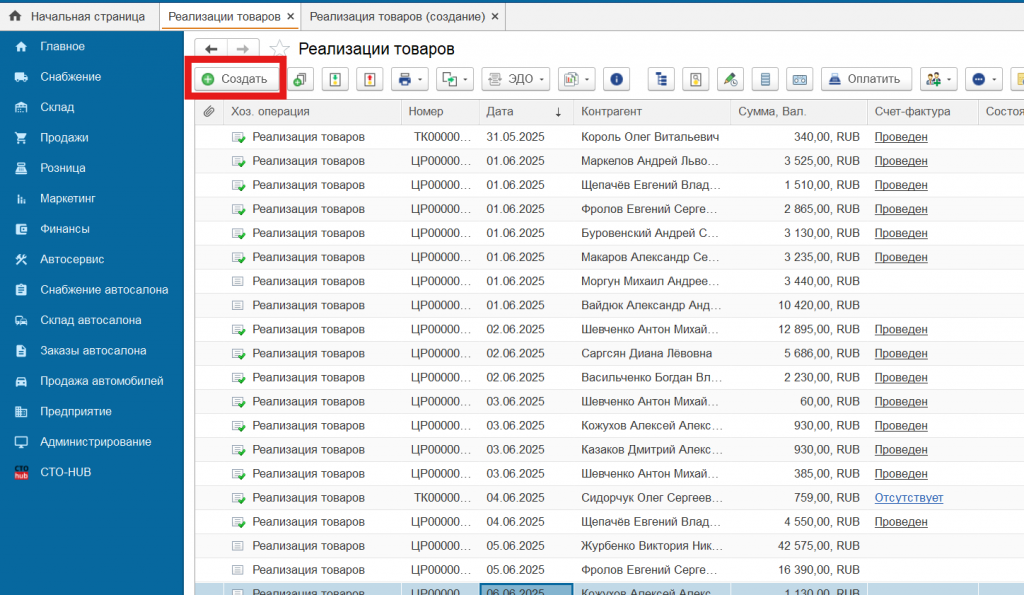 Нажимаем на Реализации товаров, затем нажимаем Создать