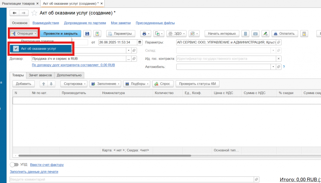 Далее меняем хоз.операцию на Акт об оказании услуг