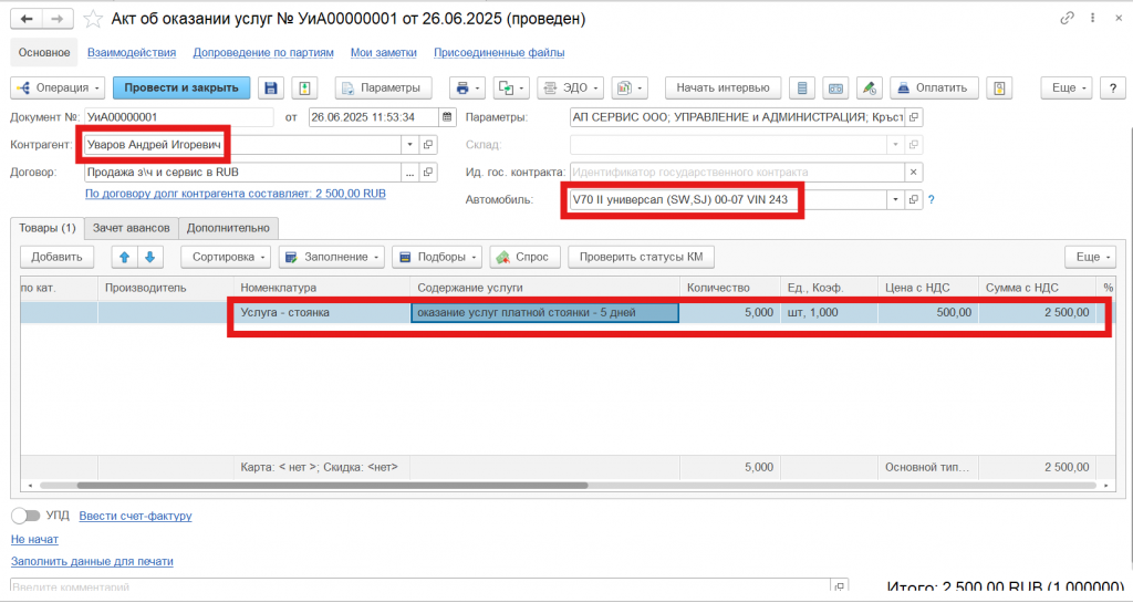 Данный документ является документом реализации услуг. Он подходит для продажи услуг не являющихся основной деятельностью компании. Рассмотрим его на примере оплаты клиентом стоянки автомобиля на территории СТО.