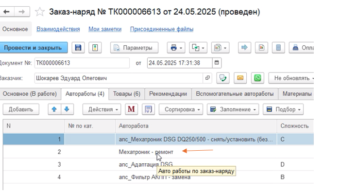 Если в заказ-наряде учавствую услуги сторонних организаций, требуется сделать на них поступление. МК во вкладке «Автоработы» добавляет работу субподрятчика