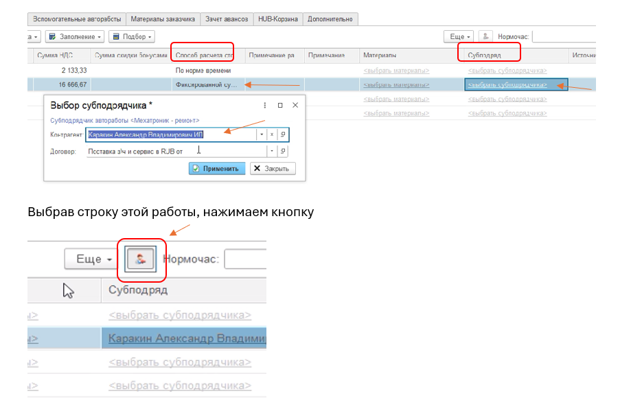 При прокрутке таблицы влево, находим столбец «Способ расчета» — устанавливаем «Фиксированной суммой», следующий столбец «Субподряд» — выбираем контрагента в открывшемся окне. После того как контрагент выбран, нажимаем «Применить», окно закроется, строка станет серой и отобразиться контрагент субподряда.