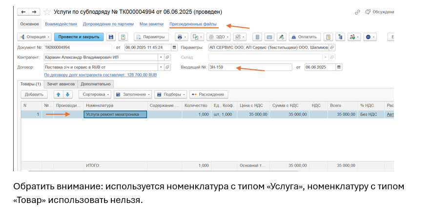 Откроется окно создания «Услуги по субподряду», где исходя из документа поставки заполняются все реквизиты. Номенклатура услуги должна совпадать с работой в заказ-наряде, так же можно ввести уточняющий комментарий в поле «Содержание». Обязательно присоединить скан входящего документа при его наличии. Далее провести и закрыть поступление, записать изменения в заказ-наряде.