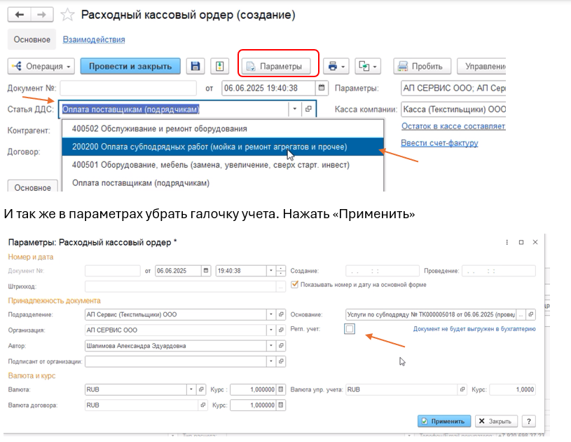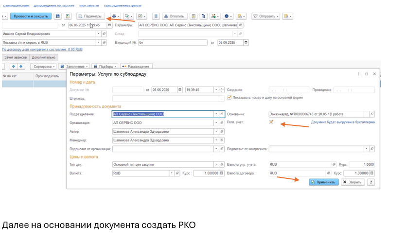 Возвращаемся в документ созданного поступления «Услуги по субподряду», заходим в параметры и убираем галочку с бухгалтерского учета, чтобы этот документ не выгружался в 1С Бухгалтерия, нажимаем кнопку «Применить».