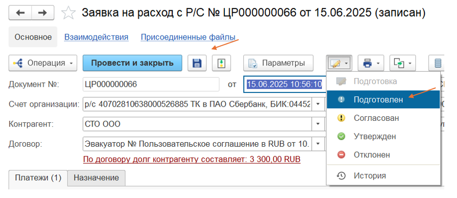 Когда все реквизиты заполнены и проверены и прикреплен скан документа, сохраняем документ и меняем статус утверждения документа на «Подготовлен». На данном статусе провести документ невозможно, поэтому только сохранение