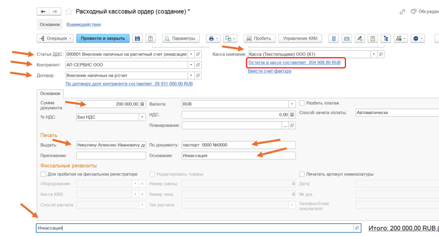 Инкассация из кассы компании производится через расходный кассовый ордер, инкассируемые деньги передаются лично в руки инкассатору.