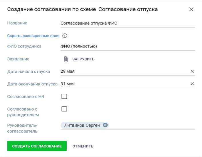 Название – Прошу согласовать отпуск ФИО сотрудника – ФИО Полностью