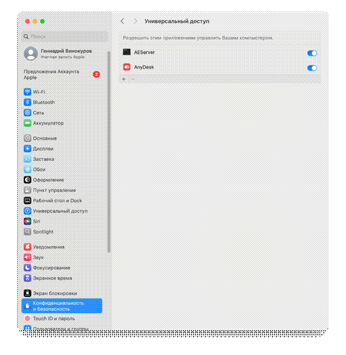 Во всех параметрах, где указаны AnyDesk или AEServer нужно проставить разрешающие флаги. При их установке система запросит подтверждения прав администратора – пароль на вход либо скан отпечатка пальца Touch ID.