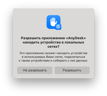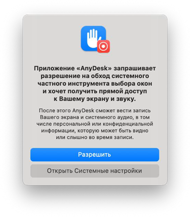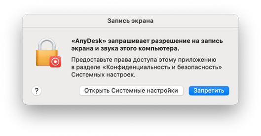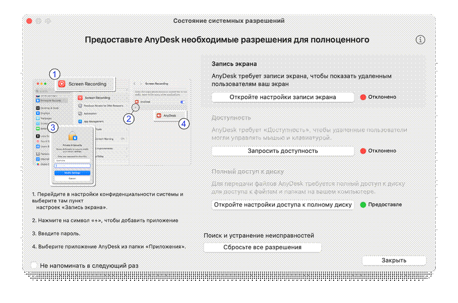 Разрешения, которые необходимо предоставить, отображаются в этом окне справа. Если с ними всё в порядке, данное окно при запуске AnyDesk не появится. Если разрешения на последующих шагах были проставлены, а окно всё равно появляется, нажмите в нём кнопку Сбросьте все разрешения и пройдите все этапы предоставления разрешений снова. При нажатии кнопок предоставления разрешений будет спрашиваться разрешение на открытие программы Системных настроек в соответствующем разделе: