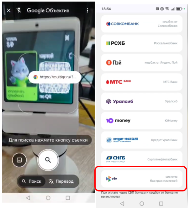 2) При помощи камеры мобильного телефона клиента и терминала оплаты: