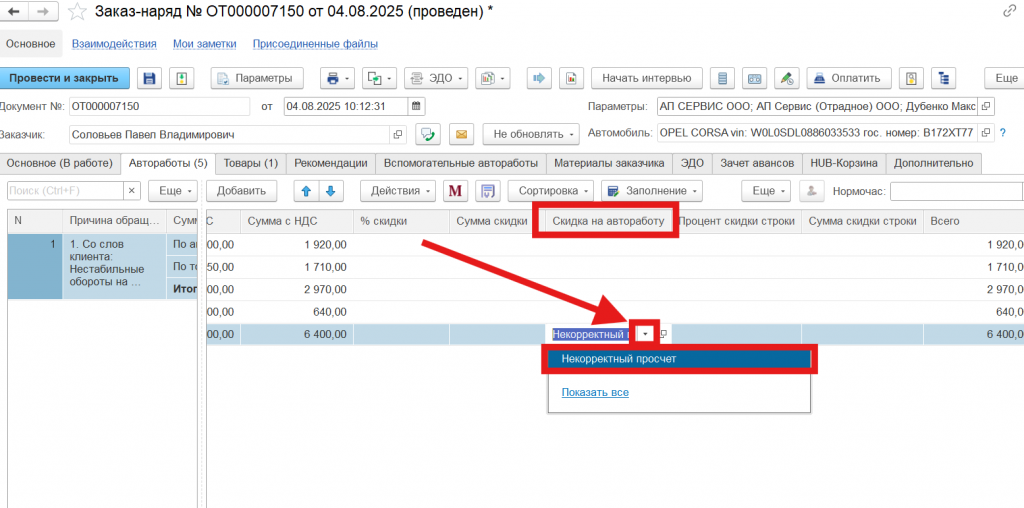 Далее в необходимой строке автоработы переходим на колонку «скидка на автоработу» и выбираем скидку «некорректный просчет»