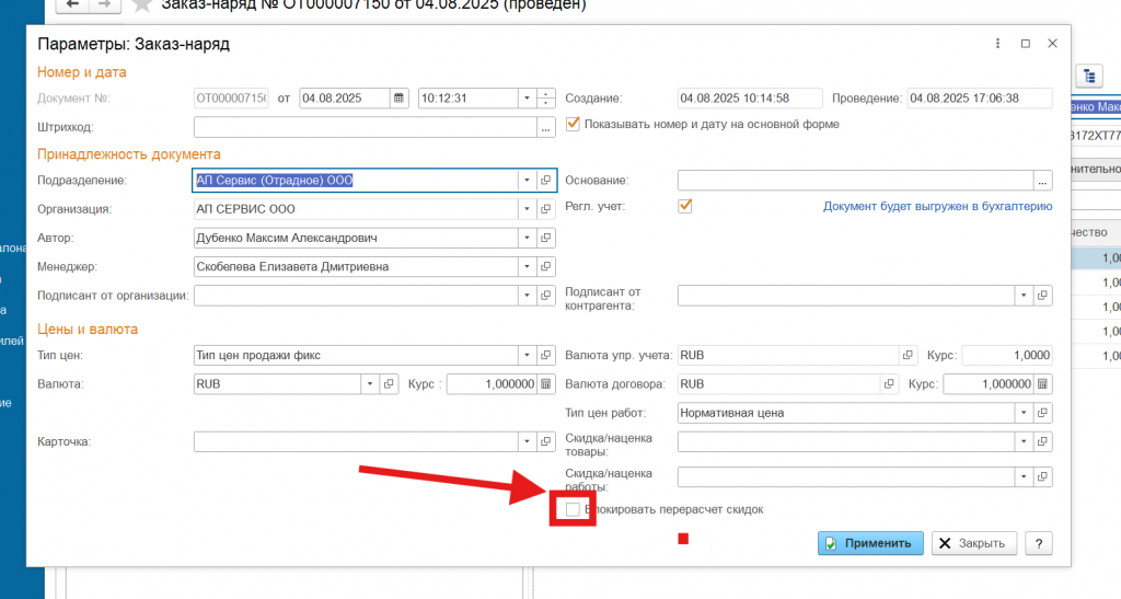 Первым делом нужно снять метку «блокировать перерасчет скидок» в параметрах заказ-наряда