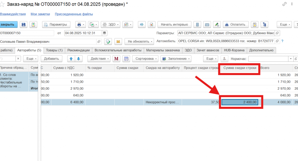 Далее указываем либо процент, либо сумму скидки. В данном примере укажем стоимость скидки. Допустим что с клиентом была согласована стоимость автоработы в 4000р. но по факту стоимость трудозатрат составила 6400. Поставим в колонке «сумма скидки строки» значение разницы в 2400р.