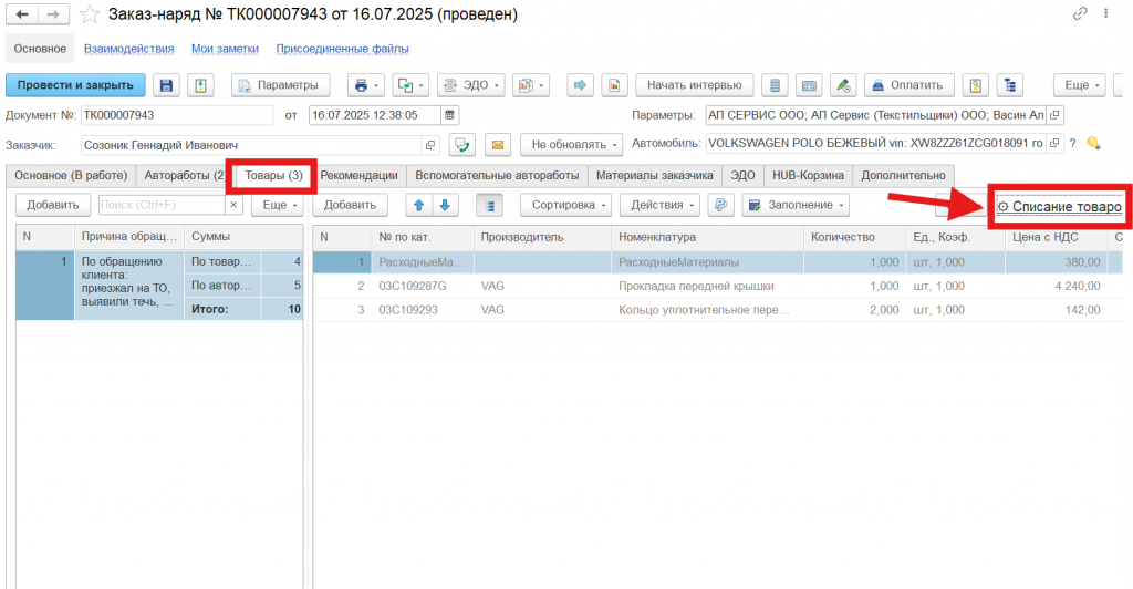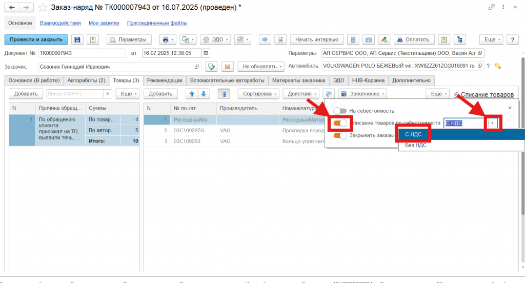 Списание товаров по себестоимости в гарантийном заказ-наряде
